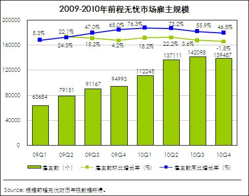 根据前程无忧历年财报数据显示,2010年前程无忧网雇主数突破10万,较2009年同期有大幅度增长。艾瑞咨询分析认为,前程无忧雇主数量的快速增长主要有两个方面的原因:一是随着网络招聘经济成本、时间等优势的凸显,更多的雇主倾向于选择网络招聘减少成本;二是2010年前程无忧虽然未增设分公司,产品和服务销售却扩大到石家庄、南昌等多个新区域。