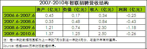 根据智联招聘母公司seek历年财报数据显示,截止2010年6月份,智联招聘总资产达到1.37亿元,负债1.25亿元,收入2.5亿元,亏损0.26亿元,亏损额达到历年最小值。根据智联招聘对外发布的数据,2010年下半年,智联招聘全面实现扭亏为盈。艾瑞咨询分析认为,智联招聘在2010年调整战略,根据中国招聘市场具体情况出发,制定相应战略,从而获得了突破性发展。