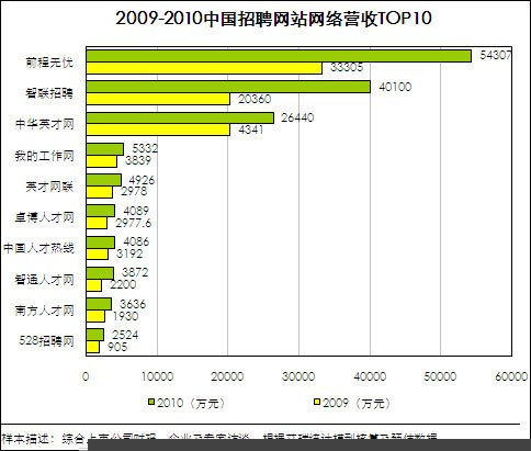 数据显示,2010年,前程无忧、智联招聘、中华英才网网络招聘服务营收分别为54307、40100、26440万元,较2009年同比分别增长63.1%、67.1%、30.5%,其中,前程无忧从2010年第二季度开始,网络招聘服务营收占比过半。