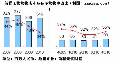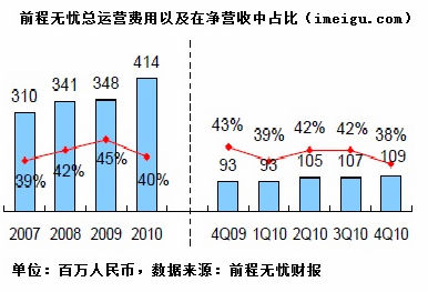 从总运营费用在净营收中占比的情况来看,2006年到2009年由38%逐步增至45%,2010年降至40%;从2009年三季度到2010年三季度的近5个季度中,2010年四季度费用占比降至最低38%。