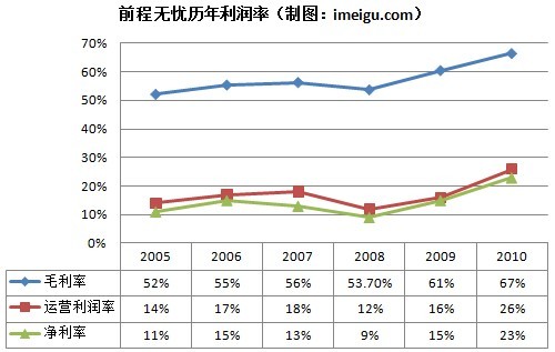由于对成本和费用控制得当,2010年前程无忧毛利率、运营利润率和净利率都达到公司历史记录最高,分别为67%、26%和23%。