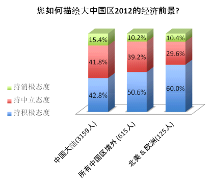 “当前企业领导人可能会感到困惑,”韦女士谈到: “有一半的受调查者(49.1%)对2012年全球经济前景持消极态度。而与此同时,近一半的受调查者(43.5%)却对大中华区的经济前景持积极态度,这可能会导致对中国增长目标的过分依赖,从而增加中国团队的压力。”在香港和台湾地区,仅有少数受调查者对世界经济前景持乐观态度,分别为6.6%和6.4%,因此,对于接受调查的主要决策者而言,对中国经济蓬勃发展的依赖程度对其区域及全球业务前景的预测显得更为关键。