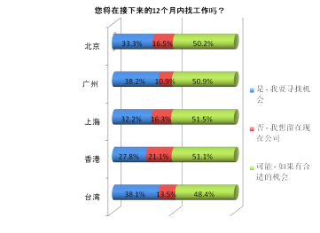 在香港,总体趋势则更为平缓,相对于去年28.6%的受调查人有计划更换工作,今年则只有27.8%。相反,21.1%的受调查者希望继续留任,去年这一数字为14.8%。
