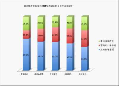 博禹中国集团分别对不同行业部门的就业前景数据进行了分析。尽管人们预计,中国这一全球第二大经济体在2012年会面临挑战,但是在这一地区,中国依然被视为创造就业机会的主要引擎。“总体而言,中国的就业前景很乐观,来自生物制药和医疗(59%)、专业服务(53%)、零售及消费品(53.7%)行业超过半数的受调查者都给出了乐观的评估。” 韦天曦女士称。