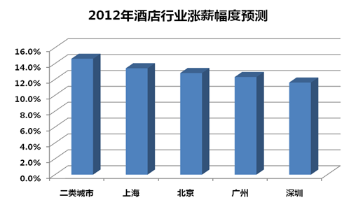 随着一线城市豪华酒店市场渐趋饱和,酒店业的重心已从北上广转移至内地经济迅速发展的二三线城市。徐州、武汉、长沙、成都、大连等城市,酒店行业薪酬涨幅均已超过14%,;一线城市上海预计涨幅最大,这跟星级酒店密集度高有直接关系,北京和广州的预计薪酬涨幅均高于12%,深圳酒店行业预计涨薪幅度为11.6%