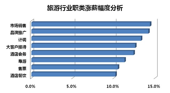旅游行业未来的扩张离不开企业市场销售和品牌推广,这两类专业人才是目前行业的稀缺人才,也是企业重点保留和激励的对象。从涨薪幅度来看,这两个职类的2012年预测涨薪幅度分别为14.4%和14.2%,高于行业平均预期涨幅。此外,计调岗位也是旅游行业核心岗位,预计涨薪幅度超过13%,而涉及商业运作的大客户接待和酒店会务类岗位预计涨薪幅度超过12%。