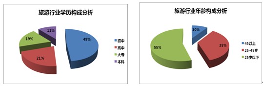 旅游行业的人才结构与餐饮和零售百货相似,需要不断的优化和完善。根据众达朴信调研数据显示,2011年全国旅游行业48.6%的从业人员是初中学历,本科以上学历占比不超过12%,一方面是因为行业知识技能要求低的原因,另一方面也可以看到旅游行业的发展侧重基层铺面服务。随着旅游行业商业化发展,大专以上学历的比重会增加。从年龄构成的角度分析,近55%的从业者是25岁以下,从这个数据可以看出基层服务人员行业经验不足的现实,因此合理优化和改善现有人才结构也是旅游行业人力资源管理者需要思考的问题。