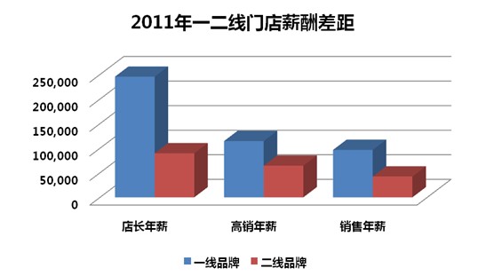 一线品牌对店面人员的产品知识结构、外语知识和形象气质等能力素质要求很高,而且利润率也远远高于二线品牌,所以一二线品牌的店面经理薪酬差距很大,根据众达朴信的薪酬报告来看,一线品牌店面经理年薪中位值达到245454元,而二线品牌的店长该数值为89553元。同样高级销售的薪酬差距也较为明显,一二线品牌该岗位的年度总现金中位值分别为114434元和64345元。有经验的二线销售人员往往被挖到一线品牌门店,薪酬差距在2倍以上应该是主要原因,一二线门店销售人员年薪中位值分别为96545元和42358元。