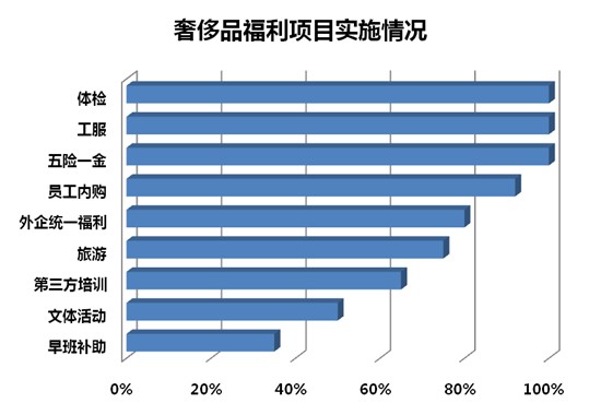 根据众达朴信奢侈品行业福利报告显示,因为奢侈品大部分都是外国品牌公司,所以几乎所有企业都为员工提供体检、工装服和五险一金。从基础福利来讲,竞争优势大于国内同行业企业。另外员工内购是奢侈品行业的特殊现象,也是一项很好的福利,一般内购价格在6折左右,部分奢侈品牌最低可以拿到4折的折扣。另外超过50%的企业提供旅游、第三方培训和文体活动,门店上早班的企业提供早班补助。奢侈品门店提供的福利项目大同小异,但人才环境日趋紧张的今天,如何体现差别性福利管理是奢侈品行业人力资源管理者需要思考的问题。