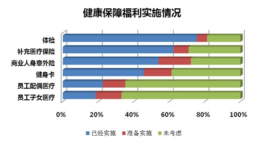 从健康保障福利来看,超过60%的企业为员工提供体检和补充医疗保险,超过40%的企业也为员工提供商业人身意外险和健身卡。这是最体现企业对于员工健康的关怀项目。未来1-2年超过20%的企业会考虑为员工的配偶和子女提供医疗服务,这将极大的提高企业的雇主满意度