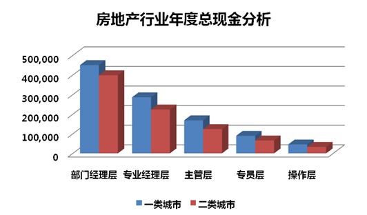 根据众达朴信监测数据显示,近三年,地产行业二类城市薪酬涨幅大于一类城市,一是因为很多大型房地产商纷纷转入二级市场,间接提高了当地行业薪酬标准,二是因为二类城市开始从一类城市大型地产商抢夺人才,并提高毕业生起薪,开始进行人才储备。随着涨薪幅度拉开,一二类城市的薪酬差距在缩小。一类城市部门经理层年薪中位值为450409元,二类城市该层级年薪中位值为398565元,薪酬差距在13%,比上一年度的15.6%少了2.6个百分点;主管层年度总现金一二城市分别为168655元和123958元,相差44697元,而上一年度相应数值为61340元。