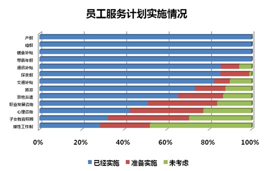 从员工服务福利来看,几乎所有地产企业都按照国家规定,有产假、婚嫁、膳食补贴和带薪年假。另外超过60%的企业为员工提供通讯补贴、探亲假、交通补贴、旅游和异地派遣。未来几年地产企业将加大职业发展和心理咨询、子女教育照顾、弹性工作制等各项福利的投入力度。