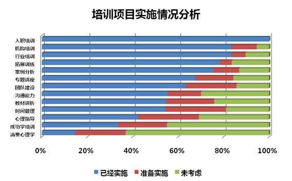 地产行业是否能在严峻形势下寻得出路,取决于人才储备和现有组织知识结构。所以如何提高组织能力和人员素质是未来几年地产行业人力资源管理者思考的核心问题。从众达朴信人力资源报告中可以看到,地产行业培训项目内容多于行业平均水平,超过80%的企业提供入职和行业知识培训,超过60%的企业提供案例分析、拓展训练、专题讲座和团队建设相关培训。另外,超过20%的企业在未来2年将实施时间管理、心理指导、成功学等帮助员工职业生涯发展的培训项目。