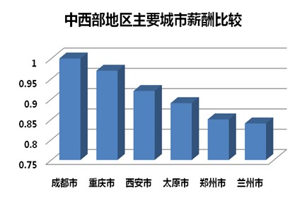 中西部地区经济发展较快,薪酬涨幅超过全国平均水平。但西安薪酬水平与成渝地区相比仍然有一定的差距。以2011年成都地区薪酬水平为基数,根据众达朴信薪酬调研数据显示,西安地区薪酬系数为0.92,落后于重庆的0.94;太原和郑州地区薪酬系数分别为0.89和0.85,兰州地区薪酬水平较低,薪酬系数为0.84。