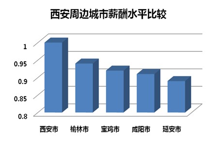 作为陕西省会城市,西安地区在经济发展、人才素质和薪资水平等方面的竞争优势都非常明显。近两年与省内其他地区的薪酬差距在拉大,以西安地区薪酬水平为基数,依靠国家级能源化工基地建设的榆林地区薪酬水平较高,薪酬基数为0.94; 借力关天经济区副中心城市的东风,宝鸡地区经济发展劲头迅猛,薪酬系数为0.92; 咸阳和延安地区近两年薪酬涨幅都超过13%,薪酬系数分别为0.91和0.89。
