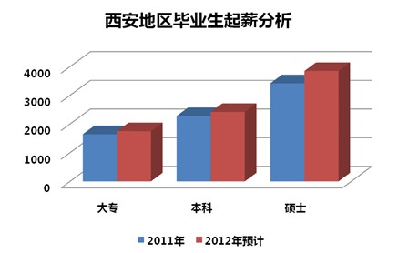 与行业薪酬水平相似,西安地区的毕业生起薪也落后于成渝地区,但薪酬差距在缩小,尤其是研究生以上学历人员。据众达朴信监控数据显示,2011年西安地区本科和硕士毕业生起薪分别是2280元和3420元,成渝地区的硕士毕业生起薪基本在3500左右,三地基本没有太大差别;预计2012年本科毕业生起薪将达到2420元,软件开发人员的毕业生起薪相对较高,部分企业可以达到3500元。
