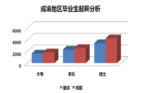 成渝地区本科毕业生起薪差距不大,根据众达朴信监控数据显示,2011年成都和重庆地区本科毕业生起薪分别为2580元和2320元,差距仅为11.2%;而两地硕士毕业生起薪差距较大,分别为4250元和3420元,可以看到成都地区对于高学历人才的吸引优势更为明显。
