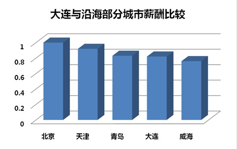 与北部沿海城市相比较,大连地区薪酬水平竞争优势不明显,仍然落后与天津和青岛,但与青岛地区的薪酬差距正在缩小,而与威海等其他沿海城市的薪酬差距拉大。以北京地区薪酬水平为基数,根据众达朴信调研数据显示,天津地区薪酬系数为0.92,遥遥领先与其他北部沿海城市;青岛和大连的薪酬系数分别为0.83和0.82,薪酬差距并不明显,大连地区部分行业如软件开发和装备制造,薪酬水平均大于青岛;与大连隔海向望的威海,薪酬系数为0.76。
