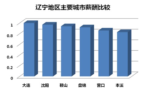 虽然与北部沿海城市相比较,大连地区的薪酬竞争优势不强,但其薪酬水平已经领跑辽宁地区。以大连地区薪酬水平为基数,根据调研数据显示,省会沈阳的薪酬系数为0.97,虽然近几年沈阳地区薪酬涨幅大于大连,但部分行业薪酬水平两地仍存在不小的差距;以钢铁和油田为支柱产业的鞍山和盘锦,薪酬系数分别为0.94和0.85;作为辽宁经济第三季的营口,近年涨薪幅度较高,已经缩小了与沈阳的薪酬差距,薪酬系数为0.86;同为钢铁重镇的本溪,薪酬系数为0.83