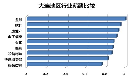 软件行业是大连市重点扶持的行业,多家世界知名IT公司纷纷把研发和业务外包中心建立在大连软件园里,带动行业薪酬水平不断上涨,已经超过房地产行业,逼近金融行业。以大连地区金融行业薪酬水平为基数,根据众达朴信调研数据显示,软件和房地产行业的薪酬系数分别为0.95和0.93;同样为大连未来重点发展产业的电子信息行业,薪酬系数为0.91;以造船和重工为代表的装备制造业,薪酬系数为0.86,已经接近石油化工和生物制造行业;快速消费品和服装纺织行业薪酬水平较低,薪酬系数为0.82和0.76。