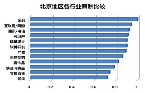 北京我国的政治文化和对外交流的中心,这就决定了北京是第三产业高度发达的城市。第三产业主要行业如金融、电子信息、IT、房地产、广告等行业在北京地区人才竞争加剧,关键核心人才缺口较为严重,薪酬水平也逐年上升。根据众达朴信调研数据显示,以金融行业薪酬水平为基数,互联网/网游薪酬系数为0.94,作为互联网行业最为集中的北京,对比与其他城市人才竞争优势较为明显,年薪过15万已经司空见惯;通讯/电信和房地产行业薪酬系数分别为0.92和0.91;同样为北京地区主要行业的建筑设计和软件开发薪酬系数为0.9,建筑设计师和软件开发人才,北京地区最为集中也最为稀缺,近三年薪酬水平涨幅都超过了15%;广告和生物制药行业薪酬系数分别为0.86和0.82,外资医药研发行业薪酬水平竞争优势明显;北京是仅次于上海地区的奢饰品总部集中地,近年薪酬涨幅较快,薪酬系数为0.82;北京地区是零售百货和餐饮行业中国内陆最为发达的城市之一,但受限与行业用人结构和利润率,薪酬水平较低,薪酬系数分别为0.74和0.72。