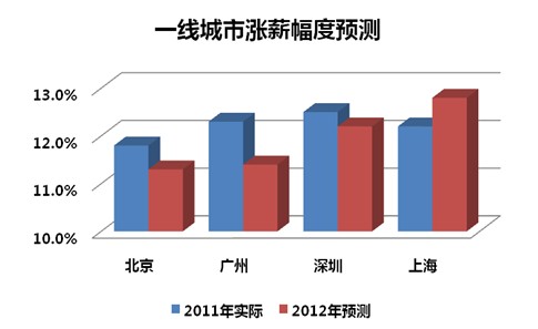 第三产业密集的北京,受经济波动的影响较小,近几年薪酬水平一直平稳增长。根据众达朴信监控数据显示,2011年北京地区实际薪酬涨幅为11.8%,2012年预计涨幅仍然超过11%,高新技术产业涨薪幅度最高,达到15%以上;2011年广州和深圳地区薪酬涨幅分别为12.3%和12.5%,这与华南地区“产业结构调整,吸引人才”和“用工荒被迫提薪”有很大关系;上海地区涨薪幅度超过12%,近年受到了周边二线城市如杭州、苏州和南京的人才竞争挑战。