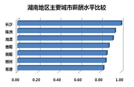 作为省会城市的长沙,薪酬水平毫无疑问地领跑湖南,而且与其他城市的差距在逐渐拉开。以长沙地区薪酬水平为基数,以重工、机车制造为支柱产业的株洲薪酬系数为0.94,以钢铁、机械加工为主要产业的湘潭,薪酬系数为0.92;以石油化工和有色金属著称的岳阳和衡阳,薪酬系数分别为0.88和0.86;此外,郴州和常德经济发展较快,薪酬系数分别为0.85和0.83。