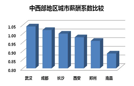 长沙地区薪酬水平在中西部地区一直处于中游以上,随着长沙经济的快速发展,薪酬水平也在不断上升,缩小了与成都和武汉的薪酬差距。以长沙地区薪酬水平为基数,武汉与成都的薪酬系数分别为1.04和1.02;2010年相对应的数据为1.08和1.05;此外,西安和郑州的薪酬系数分别为0.98和0.96,南昌薪酬水平相对较低,薪酬系数为0.89。