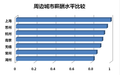 上海地区薪酬水平虽然领跑全国,各专业人才齐聚,但近年也面临着周边城市的人才竞争。苏州的整体薪酬水平在华东区紧跟在上海之后,位列第二。而杭州在打造世界“休闲之都”的同时,信息、医药、房地产、食品、服装等行业也成其经济支柱产业,苏杭以其城市环境和物价水平等有利因素,吸引了全国高端人才向其流动。以上海地区薪酬水平为基数,根据众达朴信薪酬调研数据显示,苏杭地区的薪酬系数分别为0.96和0.93;此外,上海地区中高级人才同样面临着南京、无锡、常州等地区的竞争,三个城市的薪酬系数分别为0.91、0.89和0.85。