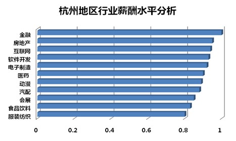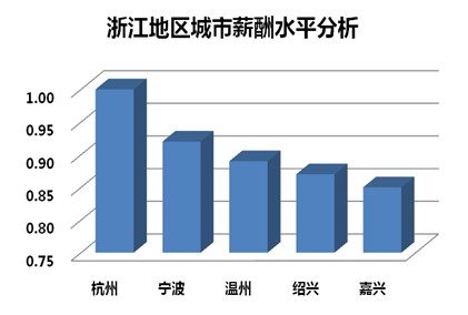 杭州地区的经济总量和整体薪酬水平均领跑浙江。以杭州地区薪酬水平为基数,根据众达朴信城市薪酬系数显示,宁波和温州地区薪酬系数分别为0.92和0.89,前者是除杭州以外,浙江省的另一个经济中心,经济持续快速发展,是国内经济最为活跃的区域之一;后者是中国民营企业聚集之地,规模以上企业8000多家,170多个中国驰名商标,超亿元企业800多家;此外,文化之乡的绍兴和嘉兴两地薪酬系数分别为0.87和0.85,前者经济发展势头迅猛,与温州和宁波的薪酬差距正在缩小。
