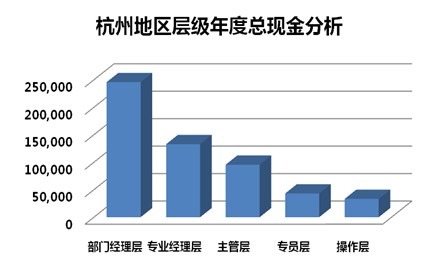 根据调研数据显示,杭州地区部门经理层年度总现金中位值为245860元,涨薪幅度为12.5%;专业经理层和主管层涨薪幅度超过13%,年薪中位值分别为132952元和95603元;主管层级不同行业间薪酬差距较大,相对差距达到3倍以上;随着毕业生起薪的不断上涨,杭州地区专员层和操作层员工涨薪幅度较大,年薪中位值分别为43250元和33458元。
