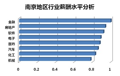 与大多数城市一样,金融行业薪酬水平领跑者的地位不可撼动。南京地区积极打造“金融强市”,基金、证券、银行、信托、期货等金融业态发展势头良好。以南京地区金融行业薪酬水平为基数,南京地区支柱产业的软件和电子行业薪酬系数分别为0.92和0.89,前者已经超过上海和浙江全省,将成为南京地区的第一支柱产业;同为南京地区主要行业的汽车、化工和机械薪酬系数分别为0.86、0.83和0.78;生物医药和房地产行业薪酬涨幅较高,薪酬系数分别为0.88和0.94。