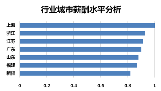 沿海的浙江、江苏、山东、广东、福建和上海聚集了全国四分之三的纺织企业,整体行业竞争能力较强。以上海地区纺织行业薪酬水平为基数,浙江、江苏和广东的薪酬系数分别为0.93、0.91和0.9,专业管理和技术工人的薪酬水平不相上下;山东、福建和新疆行业发展也较为迅速,地区薪酬系数分别为0.88、0.87和0.82,因为行业整体薪酬水平不高,所以主管层以下岗位地区薪酬差异并不十分明显。