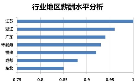 我国家具行业已经形成了几个较大的产业集群,其中华东和华南地区企业竞争力较强。华东产业圈以江苏地区为中心,以生产国际家具为特色,人才吸引能力较强,整体薪酬水平居全国之首,浙江地区以生产现代和欧式家具为主,地区行业薪酬系数为0.96;华南产业圈以东莞、顺德和深圳为中心,企业数量较多,人才竞争也比较激烈,地区薪酬系数为0.93,;同在华南的福建地区行业发展潜力很大,薪酬系数为0.92;环渤海和东北地区的薪酬系数分别为0.93和0.85,前者有比较知名的家具流通集聚地香河家具城,后者则以生产实木家具为主。西南产业圈以成都为核心,行业发展较为迅速,产业集群程度较高,地区系数为0.88。