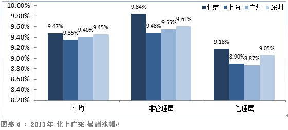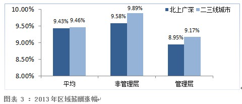 本次调研,超过1000家企业向科锐国际提供了2013年调薪数据,其中,国企、民企、外企样本比例各占三分之一。结果显示,2013年受访企业平均薪酬涨幅为9.43%,跌至2010年以来最低水平,其中,管理层平均薪酬涨幅9.03%,非管理层为9.78%。