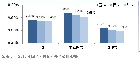 在所有受访企业中,国企2013年平均薪酬涨幅位居第一,达到9.47%;其中,非管理层薪酬涨幅为9.83%,管理层涨幅为9.12%。