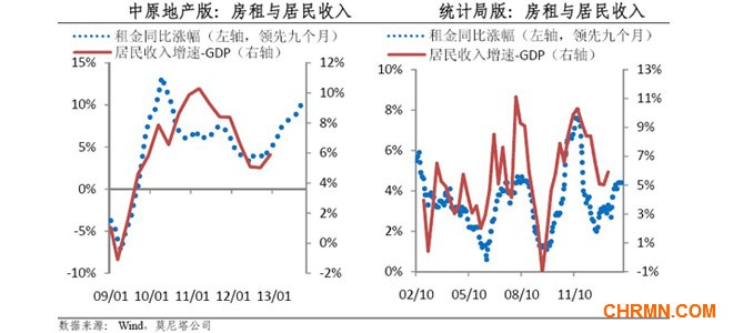 过去十多年的经验数据显示,房租同比增速大约领先城乡居民收入超额增速9个月左右,无论用统计局CPI中的房租分项,还是用民间中原地产的租金指标,结果都比较类似。
