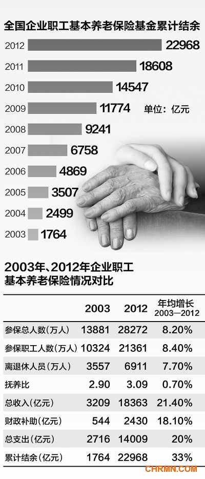 “2003—2012年全国企业职工基本养老保险基金”情况表显示,到2012年底,累计结余22968亿元,比2003年增加21204亿元,年均增长33%。