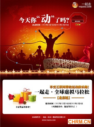 2013年1 月7日至1月20日北京协和医院、北京医院、北京首钢医院、北京中医院等20家机构参加了一起走举办的一起走?全球虚拟马拉松公开赛(北京站)活动。活动反馈报告显示:100%的参与者认为这是一个有趣的团队活动;98.44%认为是一种很好的开始锻炼方法;96.88%认为他们在竞赛后运动更频繁了;93.75%希望参加下一次竞赛。