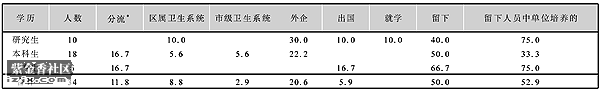 3.1拓宽人才梯队培养渠道 科学构建具有我区特色的人才培养体系,增长才干,着力提高各级各类卫技人员应对各种复杂局面的素质和实际工作能力,进一步拓宽人才培养渠道:(1)发挥院校主渠道作用,每年组织一定比例的年轻卫技专业人员选送深造或培训,有利于留住人才。在1998~2005年引进或培养获得大专以上学历人员中29.4%(10/34)由单位培养获得个人最高学历,在留下的人员中更高,占52.9%(9/17)。而且表1所示,学历越高、流失率越高,研究生最容易流失;留下的研究生主要由单位培养,占75.0%。(2)逐步加大继续教育的比重,做到“请进来教,走出去学”。(3)提倡和鼓励自学,不断提高各级各类卫技人员履行职责所必需的知识素养。(4)送其他相关单位培训,如送区卫生局或市疾控中心等相关部门及培训基地进行培训。(5)重视公共卫生与临床医学、卫生检验、管理与法律、心理学、社会交际沟通等学科专业的交叉渗透,扩大公共卫生人员知识面,创造条件,加强与公共卫生相关单位的交流与合作,培养有现代公共卫生理念的高素质人才。(6)通过跨行业、跨领域交叉培训的方式,培养医学 公共卫生的复合型人才,这种既懂医又懂防的人才到社区很受欢迎。(7)完善预案,通过演练,增长突发事件知识、提高现场处置能力。