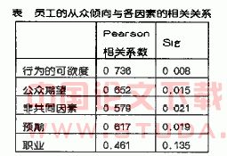 在此调查的基础上可得出如下结论:开放式群体在遇到事件时从众比例较低;从众行为对于行为可欲度高的事件是个普遍现象,不能证明个体不能忍受风险或个体交往时抱持自我观点。但对于行为可欲度低的事件从众,往往个体较为固执;行为可欲度高的事件对从众行为牵引力量大,行为可欲度低的事件对从众行为牵引力量小;由于个体职业与身份的不同,从众行为产生的概率也不同;对于无倾向的事件,从众行为取决于支持该事件人数的多寡。实际的研究中还对员工的从众倾向与各因素进行了分析,发现相关关系明显,具体的统计数据见上表。