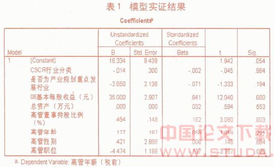 其中,y:高管税前年薪;x1:CSCR行业分类;x2:高管所属企业是否为产业规划支持企业,不支持为“0”,支持为“1”;x3:06年基本每股收益;x4:总资产;x5:高管董事持股比例;x6:高管年龄;x7:高管性别,男为“1”,女为“0”;x8:高管职位;β:其他因素。