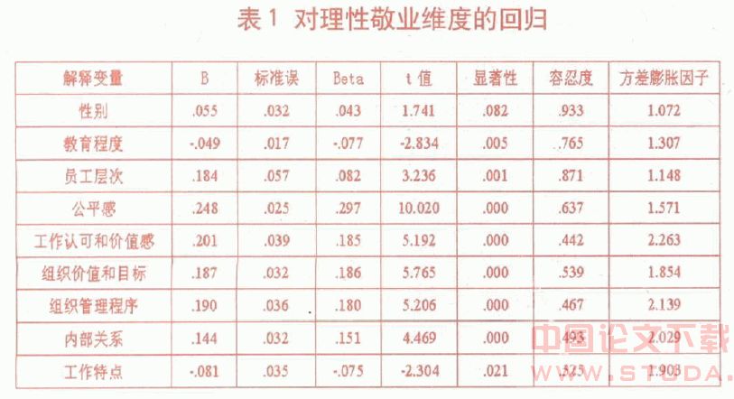 由表中结果可见,进入模型的六个敬业度影响因素均极其显著(p<.001)或显著(p<.05)存在,六个影响因素全部进入最终模型,最终模型调整后的判定系数达到.552,模型的显著性小于.001,达到极其显著水平,因此理性敬业度影响因素回归模型存在。方差膨胀因子均远小于5,说明解释变量间不存在多重共线性问题,得出的回归模型是有极其显著的意义的,假设H1得证。