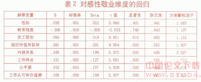 由表中结果可见,进入模型的五个敬业度影响因素均极其显著存在(p<.001),最终进入模型的影响因素有五个(除了因素“组织管理程序”),最终模型调整后的判定系数达到.463,模型的显著性小于.001,达到极其显著水平,因此感性敬业度影响因素回归模型存在。方差膨胀因子均远小于5,说明解释变量间不存在多重共线性问题,得出的回归模型是有极其显著的意义的,H2部分得证;控制变量的影响未达显著。