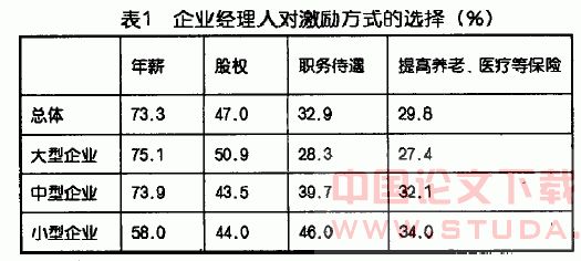 从表1可以看出,目前我国企业经理人人力资本的薪酬方式主要有四种:一是年薪制,包括基薪(基本年薪或基本收入)和效益年薪(效益收入、风险年薪或风险收入)。基薪是一种固定性的、无风险收益;风险收入是一种浮动性的,有风险收益;二是股权收益,这是一种长期的、高风险收益;三是职位消费(特殊津贴),这是一种特权收益;四是福利保险,包括商业保险、养老金、离职补偿等,是一种保障性收益。而企业经理人对激励方式的选择多集中在年薪制和股权激励。