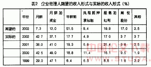 回顾我国经理人人力资本薪酬激励机制的发展历程可以看出,经过20多年的改革探索,我国企业经理人人力资本薪酬激励机制发生了比较大的变化,取得了一定成效,这其中最显著的两个特征是:一是企业经理人的薪酬收入水平有所提高。二是初步形成了多元化的经理人收入分配格局。经理人的收入构成由月薪或月薪加奖金的构成模式转变成了利息、债息、股利等多元素的薪酬模式,中国企业家调查系统2000年4月的调查报告显示,从对企业经理人收入形式和收入水平的调查数据看,收入水平与收入形式有一定联系。从年收入6万元以上的较高收入情况看,采用期权股份形式的比重最大,其他几种收入形式在6万元以上收入的比重依次为:股息加红利、年薪制、风险抵押承包制、月薪加奖金和月薪;从年收入2万元以下的较低收入的情况看,采用月薪形式的比重最大,其他几种收入形式的比重依次为:风险抵押承包制、月薪加奖金、股息加红利、年薪制和期权股份。由此可见,不同的收入形式体现着不同的收入水平,期权股份形式多是较高收入水平,股息加红利和年薪制形式多是中等偏上收入水平,风险抵押承包制和月薪加奖金形式多是中等偏下收入水平,单一月薪形式多是低收入。如表2所示: