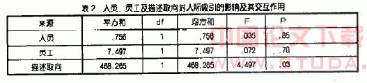 由表2的结果可知:描述取向的在0.05水平上主效应显著。经过事后分析表明:员工对反自身利益描述的人员接纳度(M=36.48,SD=6.77)显著地大于对极力正向描述的人员接纳度(M=32.18,SD=8.56)。
