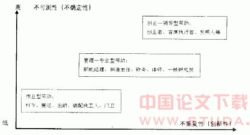 按两个维度将劳动加以分析:第一,劳动的重复性,即劳动的内容与方式在不同时间里是否简单重复,还是每一次劳动都要涉及对新信息的处理与新情况的应对。打字员的打字工作可能是几乎完全重复的,而技术研发人员的研究工作则是因题而异,几乎每项新的研发都涉及大量“第一次”面对的难题。从完全重复到高度创新,不同的劳动可以排列出不同程度的重复或创新性。第二,劳动成效的可测度性,即劳动成果在多大程度上可以进行定量的测度。搬运工的搬运数量是完全可以计量的,而研发人员的成果呢?就不容易衡量好坏了,不同劳动的可测度性或其反面,不确定性也可以从低到高加以排列。这两个指标组合,可以把劳动分类如下: