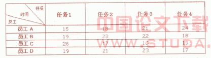 首先,随机指派一人完成一项工作,从而达到局部最优。然后,不考虑任何扰动因素对其他任务进行指派,其时间矩阵为: