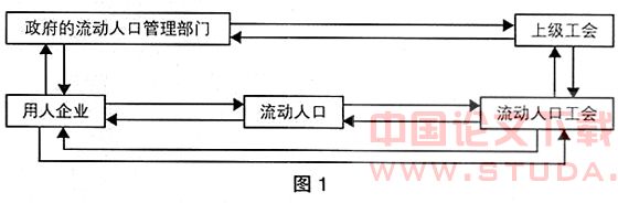 流动人口工会主要承担以下职责:为进城务工人员提供就业登记、岗前培训,提供就业信息,推荐就业;提供法规政策咨询和侵权投诉等服务,指导进城务工人员与用人单位依法签订劳动合同;履行代言人的职责——代表进城务工人员与用人单位进行集体协商并签订集体合同和工资协议;保护进城务工人员合法权益,督促用人单位改善劳动安全、卫生条件,帮助解决进城务工人员与用人单位之间的劳资纠纷;参与职工重大伤亡事故和严重职业危害问题的调查处理;帮助解决进城务工人员基本生活方面存在的问题。流动人口、流动人口工会、上级总工会、政府的流动人口管理部门以及用人企业之间的关系分析如图1所示。